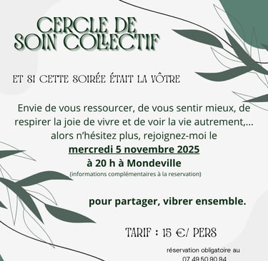 Ce cercle sera un moment d'échange et de relaxation, je serai accompagnée de mes bols tibétains, de musique relaxante, des messages pourront être transmis aux membres du groupe, chacun vivra ce moment à sa manière il n'y a pas de règle, et si le lendemain certaines douleurs ou tensions ont disparues alors il faudra remercier la magie du cercle de vous avoir libéré.